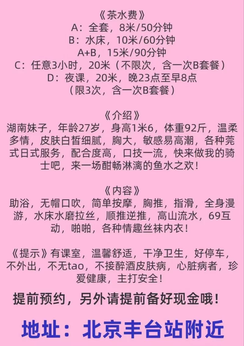 服务项目: 鸳鸯浴,漫游,胸推,69式,冰火,口活,爱爱