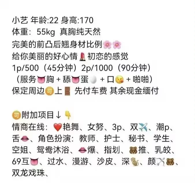 那天,开车从外地回来闲来无事,他朋友说那小姐不少,开车前往,到那一看还挺多,问了问价格,全活100就找个小点得,进去小屋才知道,戴套吹当时就没什么激情了,后来小姐连上衣都不脱,就说快点。。。十分不顺,劝大家注意。。一定要说清楚在玩。。。